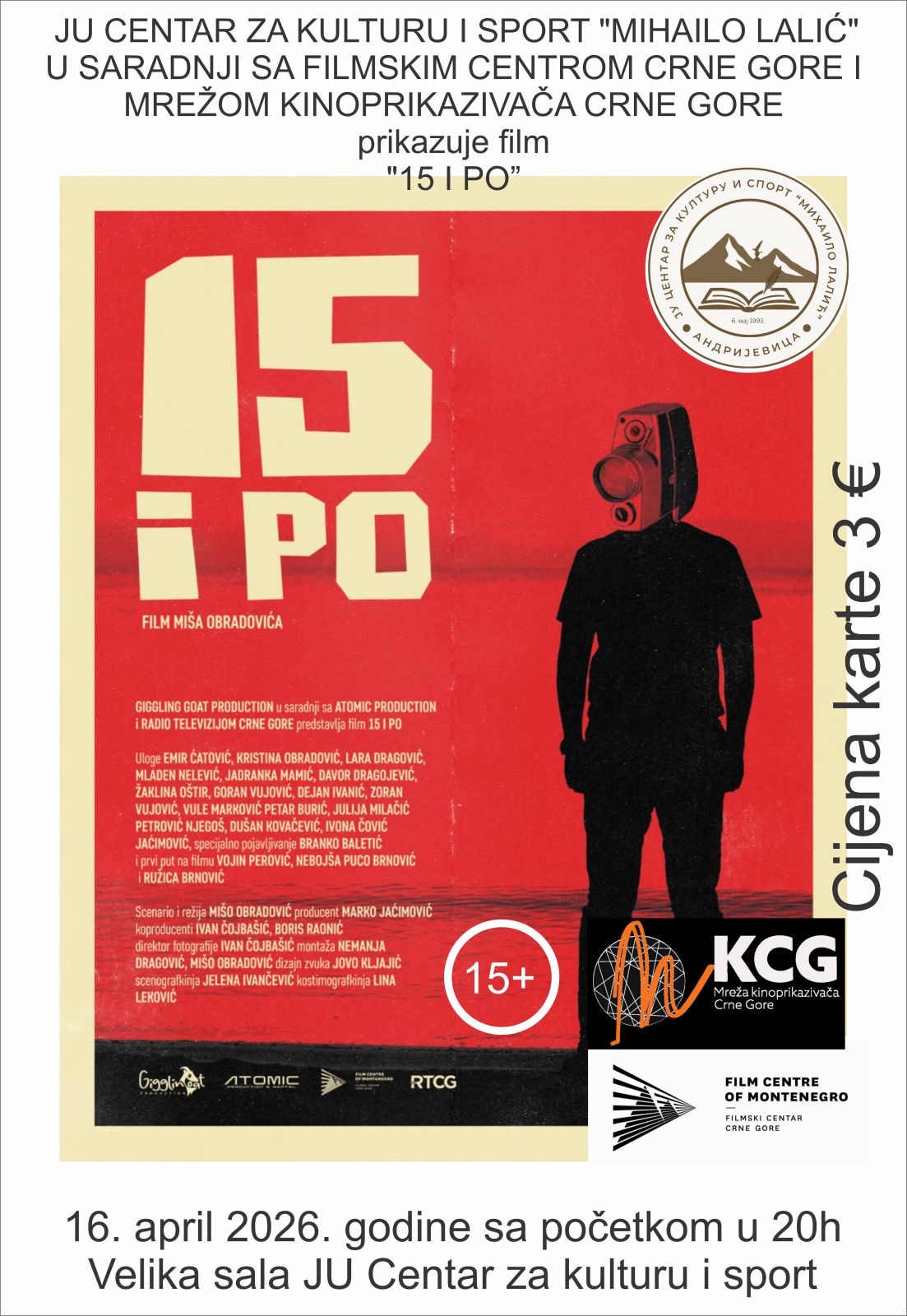 Public Institution Center for Culture and Sports “Mihailo Lalić”, in cooperation with the Film Center of Montenegro and the Cinema Network of Montenegro, will screen the film “15 and a Half” (15+) on April 16, 2026, starting at 20:00 PM. The film will be shown in the large hall of the Center for Culture and Sports. Ticket price: $3.00.