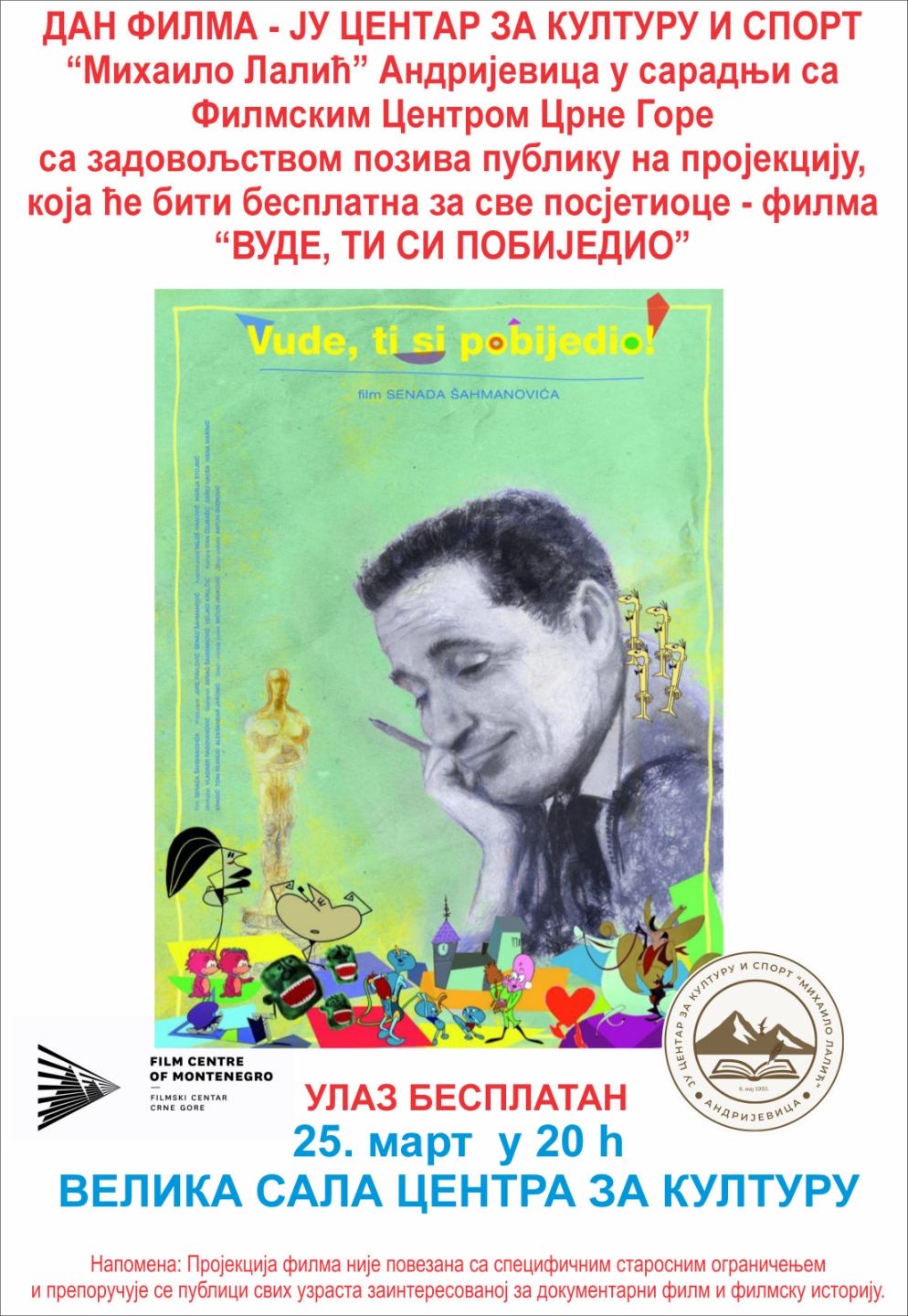 JU Centar za kulturu i sport “Mihailo Lalić” i Filmski centar Crne Gore sa zadovoljstvom pozivaju publiku na projekciju, koja će biti besplatna za sve posjetioce. Film “Vude, ti si pobijedio” biće prikazan u velikoj sali Centra za kulturu i sport ,,Mihailo Lalić” Andrijevica, 25. mart 2026. sa početkom u 20 časova.